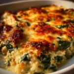 Een troostrijke ovenschotel met kip, spinazie en rijst, bedekt met gesmolten kaas.