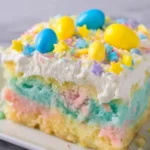 Een snel en eenvoudig Paas Poke Taart recept met witte cake, romige vanillepudding en kokos.